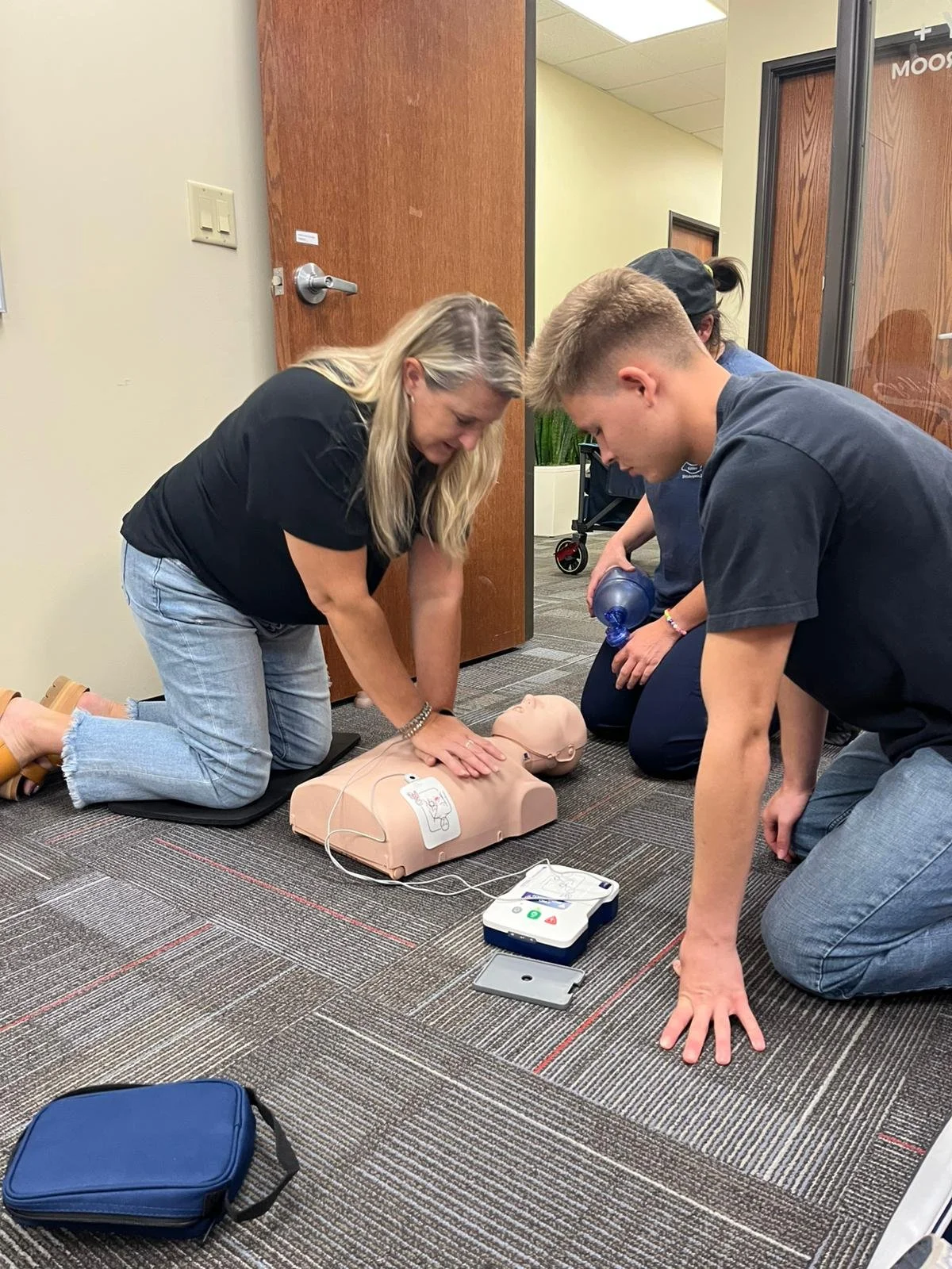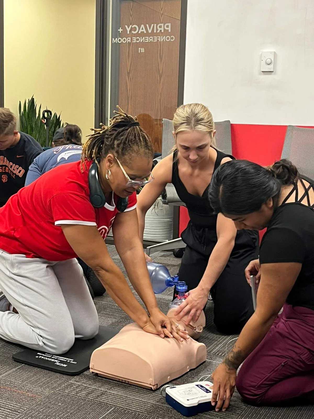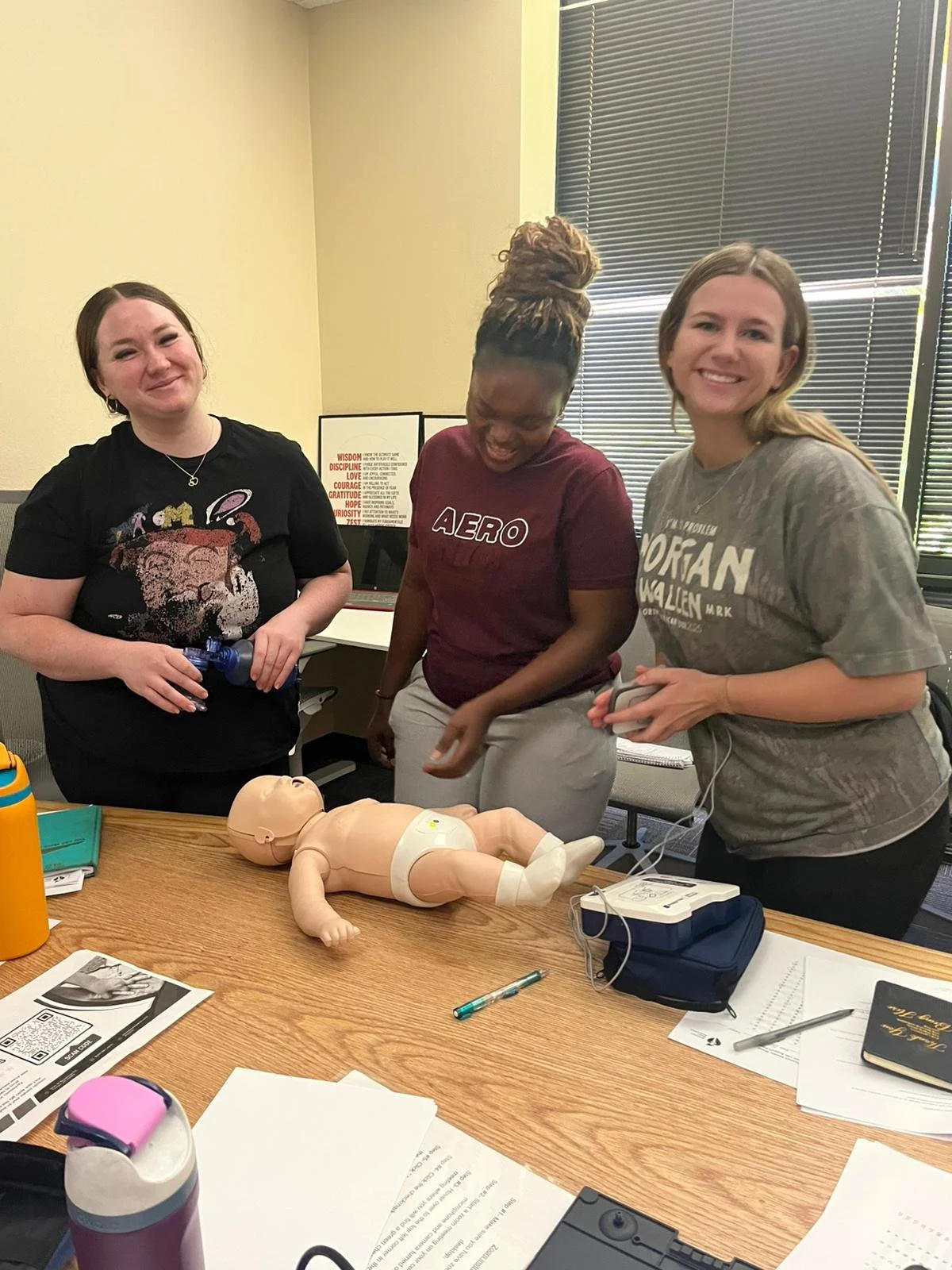 Three women smiling and leaning towards a table with a baby mannequin, CPR training equipment, and papers in a classroom or office setting.